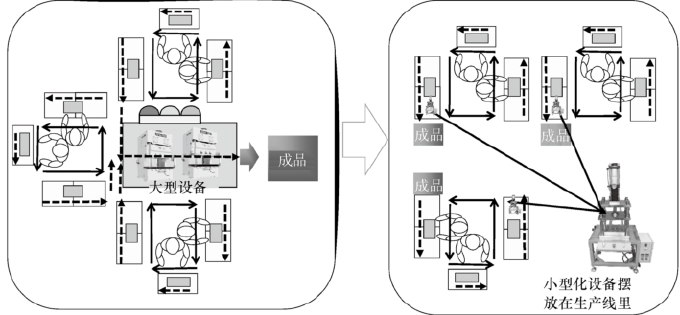 大型設備往往會為了追求生產的最大化而犧牲產品的切換次數,這容易造成生產過量,生產了很多不需要的產品放到倉庫中。另外,大型設備在做流程化生產時,很難編排到生產線中形成連續流,這是因為設備太大、設備運行速度過快、很多生產線共用導致的。同時,大型設備的操作區域比較大,容易造成動作浪費和移動上的浪費。小型設備具有以下特點:節省空間,設備之間的距離比較近,當流程變化或實驗新產品時,把它們移動到另外的地方更容易。設備小型化,價格也就更便宜,這樣可以進一步擴大生產線,同時由于小型設備的穩定性較強,可以減少維修的等待時間。小型化設備改善如下圖所示。